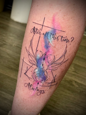Katie is one of our tattoo artists and studio owners. She has been tattooing since 2020. Her favourite things to tattoo include bold & bright colour, florals, mandala, script and anything Disney, 80s/90s nostalgia or horror related.